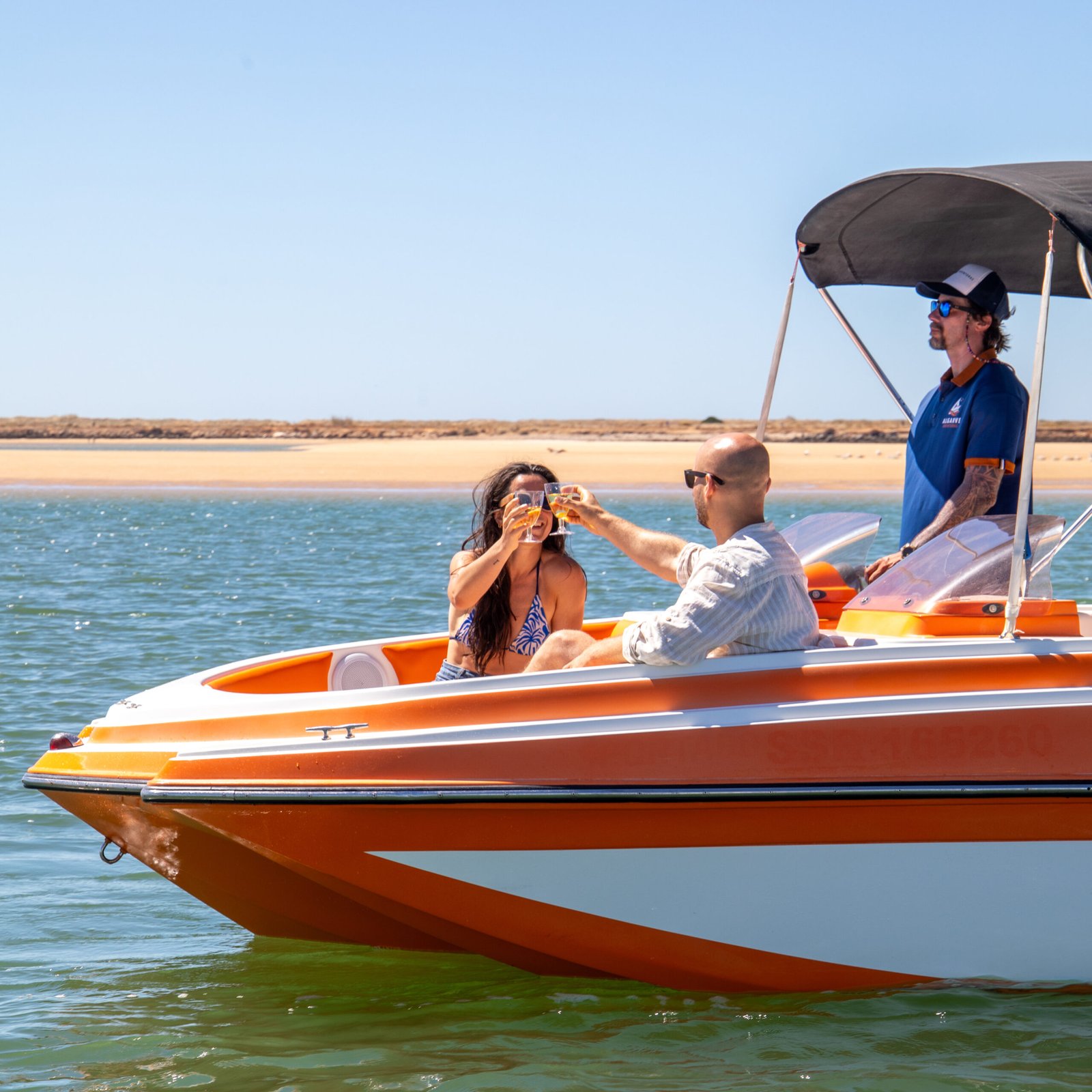 Alternatively, head east to the serene and sheltered Bay of Alvor. Known for its calm waters and natural sandbanks, this idyllic setting allows the boat to anchor right by the shore. Step straight into shallow, turquoise waters, enjoy refreshing swims, or paddle effortlessly in a tranquil environment, perfect for relaxation and connection with the sea.